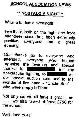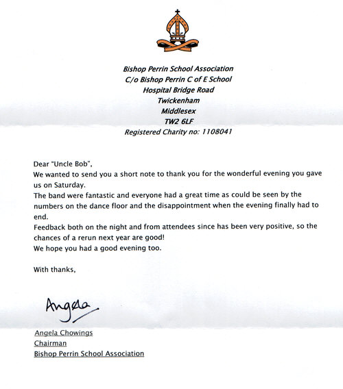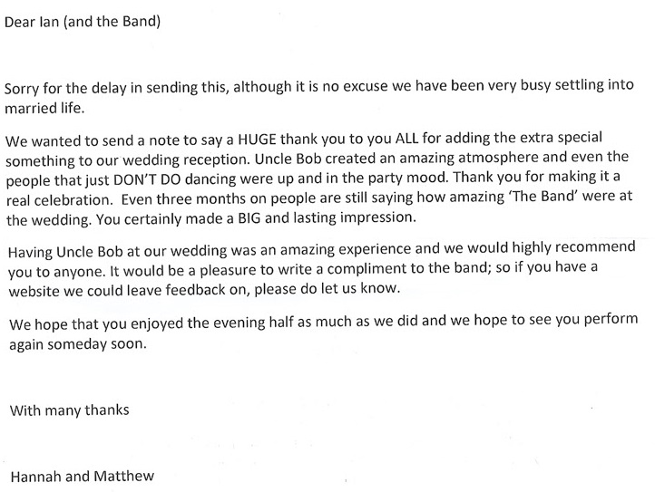 We just wanted to say thanks again for the fantastic performance you and your band put on. Everybody we have spoken to since the party has commented on how good you were. Please pass our thanks onto your other band members too.